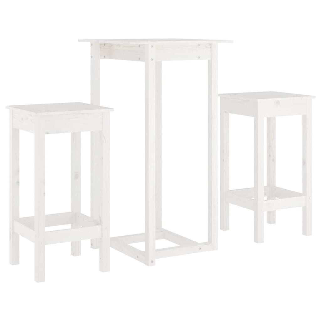 This rustic white solid pine bar set includes a square table and two matching chairs, making it a stylish addition to any space, inside or out. The solid pine wood is sturdy, while the smooth finish gives it a cool, rugged vibe, perfect for casual meals, drinks, or hangouts, boosting the atmosphere in your kitchen, dining room, or garden.