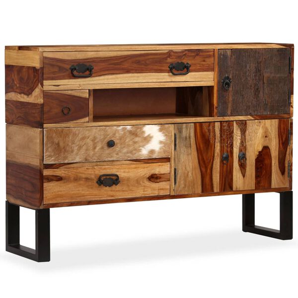 This unique sideboard is rich in decorative features, like the genuine cowhide detail, hand-carved decorations, and retro-style pulls, which give the cabinet its unique charm. The side cabinet is supported by sturdy steel feet which also add an industrial flair.