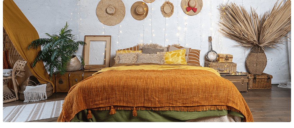 There are no two bohemian interiors that look exactly the same. This is the perfect style if you want to create something unique. Boho furniture is made of natural materials such as rattan, bamboo, wicker, jute, sisal and recycled wood. This style allows you to experience the places you’ve travelled all over again by displaying these accessories in a nice cabinet or on a side table.